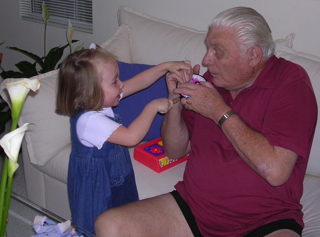Dad playing food taster with my daughter Mia. Mia loved grandpa very much. They had a special relationship.