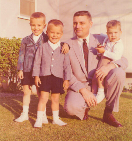About 1958 – (Left to right) That’s me, Pat, Dad and Kevin. There we are with those darn white leather shoes. When we got older and became a bit more self-aware of our cloths, we protested having to wear these shoes. My mother told us they were stylish because “Pat Boone wears them” (you younger folks will have to Google Pat Boone). Yea, it made no sense back then to us either.
