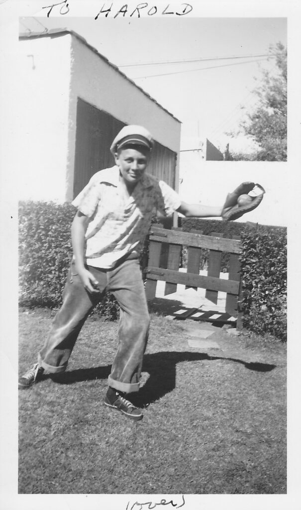 It is a 1940 photo of my Dad (Gerry) with the words “To Harold” and “over” on the front.  On the back side it says, “ ‘Jimmy Foxx’ McNamara of the Boston Red Sox what do you think of my new first baseman’s mitt?  Bob”.