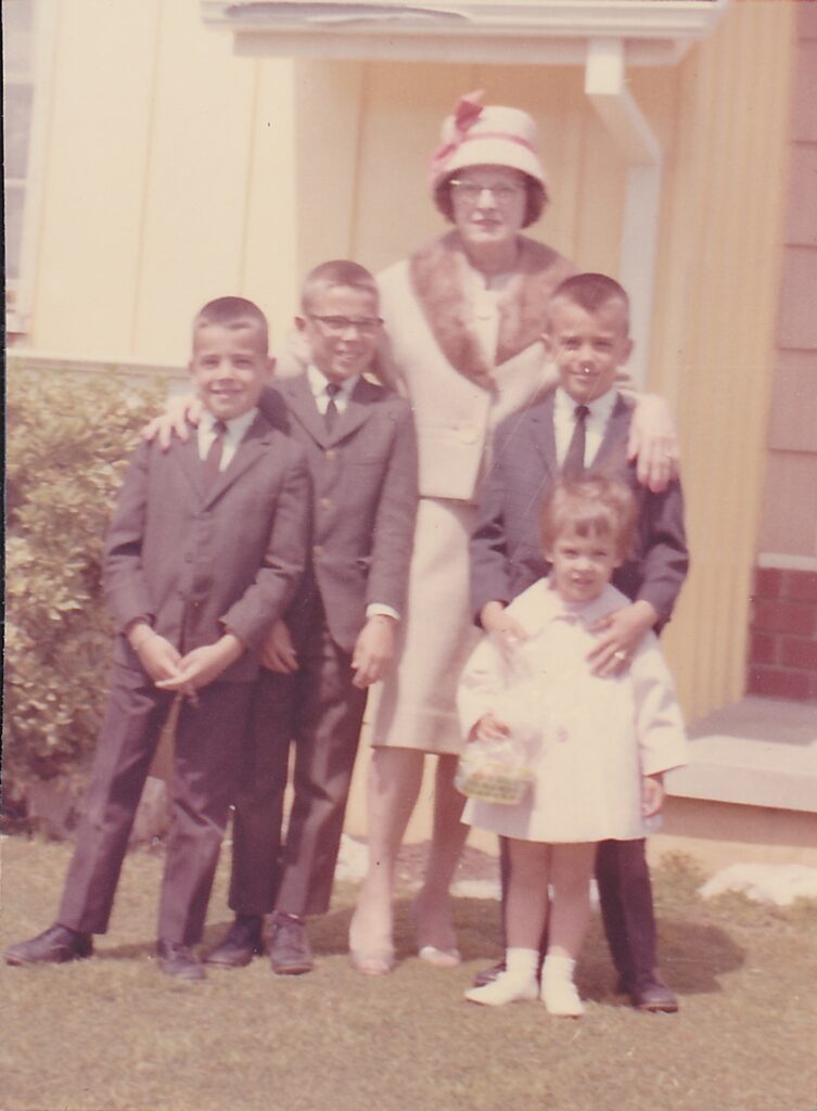 The next two are from Easter 1965 in front of our house on Garfield in Culver City.  The first one, that is me on the left, and to the right my brothers Pat and Kevin and sister Martina.  In the second one there we are with Hilda (Nana).