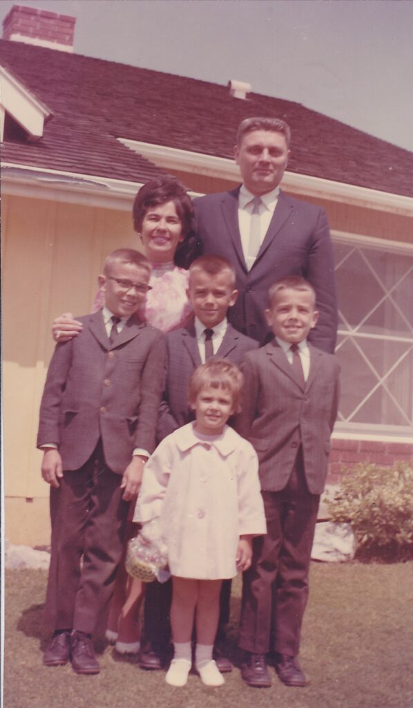 The next two are from Easter 1965 in front of our house on Garfield in Culver City.  The first one, that is me on the left, and to the right my brothers Pat and Kevin and sister Martina.  In the second one there we are with Hilda (Nana).